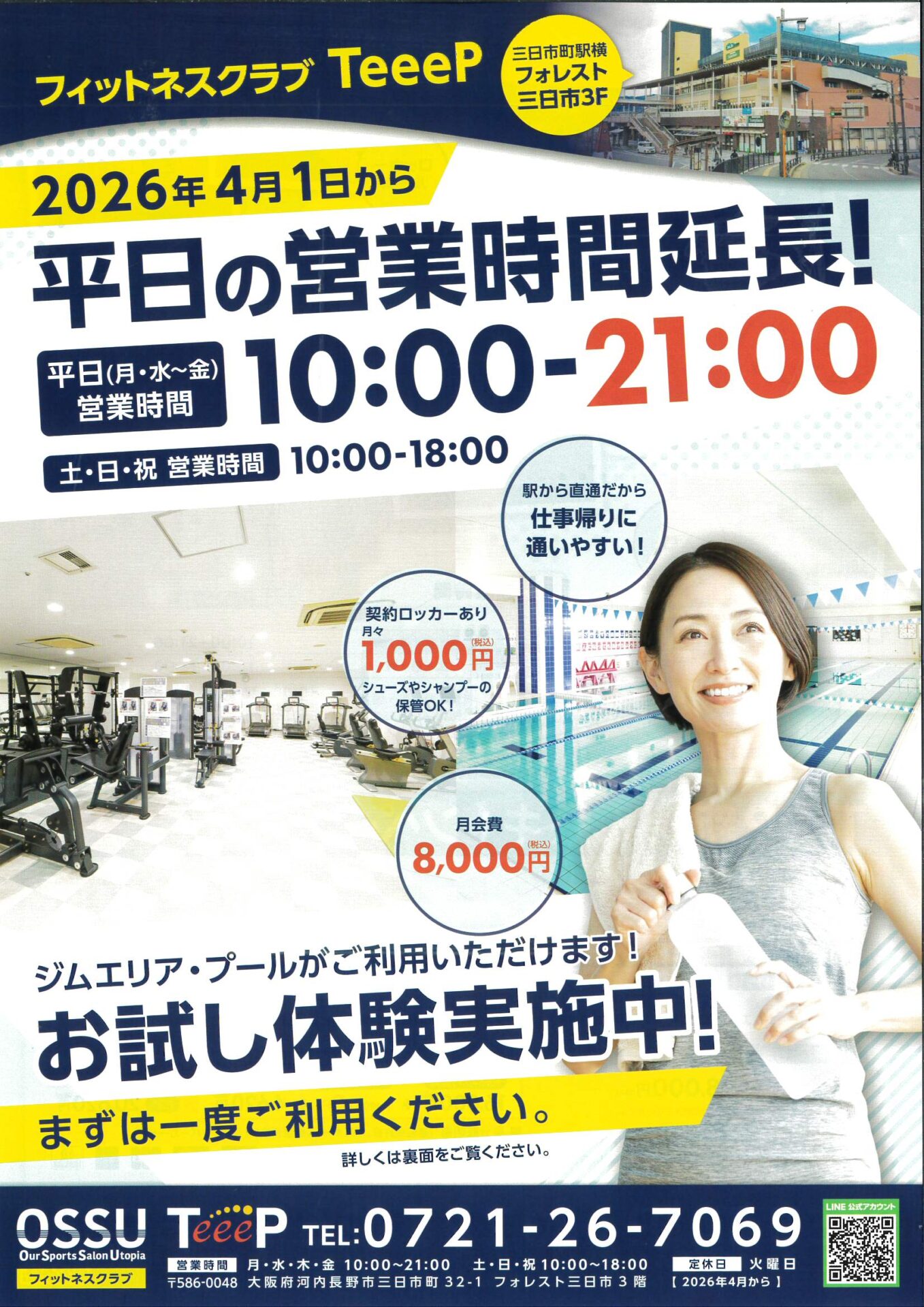 ☆4月1日から平日の営業時間延長☆ フィットネスクラブTeeep 〇平日 10:00~21:00 ジムエリア・プールがご利用いただけます 月会費8,000円 契約ロッカーあり1,000円/月 駅から直通だから、仕事帰りに通いやすい お試し体験実施中!! 是非 一度ご利用ください。 〇Teeep新規入会キャンペーン 1回体験 1,000円(1日を選択し体験) 5回体験 4,500円(当月内を選択し体験) 詳しくはチラシをご覧ください(*'ω'*) FacebookXBlueskyHatenaCopy